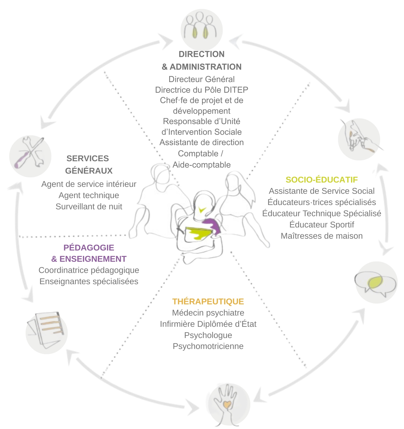 - une équipe socio-éducative : 1 assistante de service social, plusieurs éducateurs·trices spécialisés·es, 1 éducateur sportif, 1 Éducateur·trice Technique Spécialisé·e (ETS), 2 maîtresses de maison, 1 surveillant de nuit